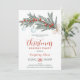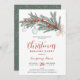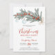 Rustic green pine red Christmas company corporate holiday party with green pine branche, red boerries, ice blue Christmas ornaments and and elegant script font typography