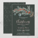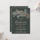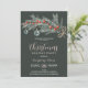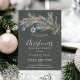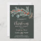 Rustic green pine red Christmas company corporate holiday party with green pine branche, red berries, ice blue Christmas ornaments and and elegant script font typography on dark green