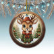 Rustic Holiday Reindeer, Xmas Deer, Christmas tree ceramic ornament featuring a round, brown wooden frame that gives it a rustic and cozy look. Inside the decoration, a cute baby wildlife animal, deer with antlers, in a cartoon graphic style, wearing a green coat, brown hat and scarf, standing in the foreground. In the background, winter wonderland snow scene, completing the holiday season charm of this delightfully unique decoration. Same Image is on the front and back. ensuring that no matter how the decor turns, it always looks festive and complete. 🦌🎄