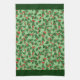Ein Vintages rustikales Ferienhaus Küchentuch mit einer Garage aus grünen, heiligen und roten Beeren und einer dunkelgrünen Grenze auf einem schlängelgrünen Hintergrund.