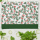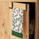 Ein Vintages rustikales Ferienhaus Küchentuch mit einer Garage aus grünen, heiligen und roten Beeren und einer dunkelgrünen Grenze auf weißem Hintergrund.