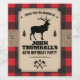 Ein Hintergrund aus rotem Büffel-kariert kontrastiert mit einem Kraftpapier-Look Panel, das an einem Burlap-Gurt befestigt ist. Die Tafel enthält die Party-Informationen, die einen Elch zwischen zwei Kiefernbäumen zeigen. Ideal für einen Geburtstag, eine Bachelor-Party, eine Saisonveranstaltung oder eine karierte oder lumberjack-Themenfeier. Die gekreuzte Axt macht unten ein individuelles Logo. Verfügbar mit passenden Produkten.