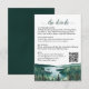 This beautiful wedding enclosure card is designed to give you extra space for whatever information your guests may need, including registry, reception, travel, accommodations, etc. as well as a customizable QR code directing your guests to your website for more information. The card features a rustic yet elegant design with watercolor landscape of Lake Tahoe surrounded by pine trees and mountains, as well as a lacy script calligraphy title reading "the details." The back is a deep marbled forest green color.