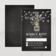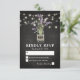 Country chic Hochzeitskarten mit einem rustikalen schwarzen Chalkboard Hintergrund, Saitenleuchten, ein Maurerkirsch mit lila Lavendelwaschern Blume, eingewickelt in Burlap mit den Paarinitialen und eine Hochzeitsvorstellung rsvp Vorlage, die leicht personalisiert ist.