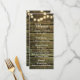 Rustikales Holz Hochzeitsmenü und eine Reihe von Lichtern. Die Speisekarte ist Teil eines Set für Hochzeitsfeiern