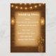 Fügen Sie Ihrem Hochzeitstisch eine Touch rustikalen Charmes mit dieser eleganten Speisekarte hinzu. Mit leuchtenden Saitenlichtern, hängenden Glaskeramiklampenlampen und zarten Blume in einem Glas vor einem hölzernen Hintergrund ist dieses Design perfekt für Anzüge, die Hochzeiten, Landfeiern oder rustikale schicke Empfänge auszeichnen. Die warmen Farbtöne und der gemütliche Stil machen es einfach, sich mit verschiedenen Themen abzustimmen und gleichzeitig Platz für Ihre personalisierten Menüdetails verlassen.