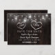 Rustikales Mason Jars String Lights Old Barn Wedding Card Design. Es verfügt über zwei Herzen mit "I DO" Typografie, Maurerkirschen, Saitenleuchten auf einem alten Scheunenhintergrund. Sehen Sie auch meine rustikale Mason Jars Old Barn Wedding Collection.