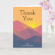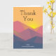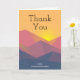 Vielen Dank Karte mit einer grafischen Abbildung mit vielen Berggipfeln mit hellgelbem Sonnenlicht hinter den Bergen. Mit geometrischen polygonalen Formen gefertigt. Einfaches minimalistisches Design. Die Farben reichen von dunkelblau bis wüstenrot.
