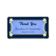 © Sunny Mars Designs. Rustikales Blue Floral Wedding Dankeschön Ihnen Labels - Individuell gestaltbare, mittelformale, Vintage rostige, elegante Hochzeitsmarken mit dunkelblauen Bandstreifen, moderne hübsche Blume vor blauem, altes Pergamentpapier-Hintergrund.