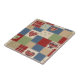 Warm rustic patchwork pattern ceramic tile featuring stitched heart motifs, plaid checks, and country-style fabric blocks in red, blue, green, and beige tones. A cozy farmhouse-inspired design ideal for country decor lovers, quilting fans, and rustic home enthusiasts. Perfect as a heartfelt gift for couples, moms, or cottage-style fans
