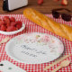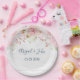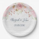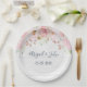 An elegant custom paper plate for your spring or summer wedding or bridal shower with lovely vintage blush pink watercolor roses and flowers, pastel greenery, a rustic wood pattern background and rose gold touches.