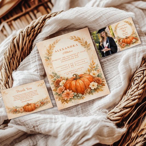 Warm autumn tones meet elegant celebration styling in this pumpkin and floral graduation design. A hand-painted heirloom pumpkin sits surrounded by soft peach blooms, muted greenery, and golden foliage, creating a romantic harvest aesthetic. The delicate wreath framing and warm ivory background give it a refined, feminine feel while still embracing cozy fall charm.