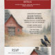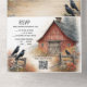 This all-in-one wedding invitation features a beautifully illustrated rustic farmstead with a classic red barn surrounded by soft, misty trees, winding paths, and wildflowers in warm, autumn-inspired hues, creating a peaceful countryside setting. Black crows perched on weathered wooden fences and scattered in the sky add depth and character, lending a slightly moody, storybook charm without overwhelming the design. The tall, vertical layout flows naturally from a rich barn-red top flap into the main invitation artwork, followed by a clearly structured RSVP section and a coordinating barn illustration at the bottom, tying the entire piece together. The muted color palette of barn red, warm neutrals, soft greens, and earthy florals gives the invitation a timeless, romantic feel that is especially well suited for rustic, country, farm, or barn-style weddings.