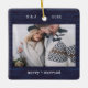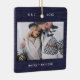 Diese schlichten und minimalistischen Weihnachtsschmuckstücke zeigen Ihr liebstes Hochzeitsgeschenk auf der Vorderseite mit Ihren Initialen, dem Jahr, und die Worte "fröhlich und verheiratet" in der weißen Schreibmaschine sehen Text auf einem rustikalen, blauen Holzaussehen Hintergrund. Auf der Rückseite befindet sich ein anderes Foto, das mit einem Overlay beleuchtet wird, sodass Sie direkt darüber noch einen oder mehrere weitere Namen hinzufügen können. Ein stilvoller Sake für Ihre erste Weihnachtszeit als Ehemann und Ehefrau.
