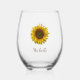 Boho floral Yellow Sunflower bloom stemless wine glass, with customizable script typography. Enjoy this personalized accessory item for yourself or as a gift for someone special.