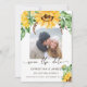Eine Art rustikale Hochzeit speichern Sie die Dattelkarte mit einem hübschen Blumenstrauß oben mit einem kleinen Bouquet unten rechts, Ihrem Lieblings-Foto, modernen und Skript-Kalligraphie Typografie verwendet. Die Rückseite der Karte ist massiv gelb mit einem weißen Sonnenblumensymbol im Muster.