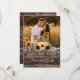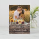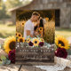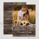 The front highlights your favorite photo, adding a personal and meaningful touch that your guests will cherish. Set against a rich woodgrain background with soft string light accents, the vibrant sunflower and deep burgundy rose arrangement brings a perfect balance of rustic charm and elegant color. The combination of script and classic typography ensures your names and wedding date stand out with clarity and style.