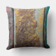 Ein quadratisches Kissen mit einer cool aussehenden rustikalen Struktur als Hintergrund. Vertikale Streifen von rot-gelber und grüner Farbe, die von einer rosteten alten Metallwand abziehen und abziehen. Sieht alt aus, verwittert und verblasst.