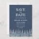 A rustic save the date card for your winter wedding with a nighttime snow covered forest in navy blue and white.