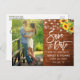 Moderne Pinselschrift, rustikales Holz, String Lights Save the Date Verlobung Couple Foto Postcard beinhaltet Sonnenblumen und botanisches Grün.