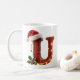 This letter 'U' is special because it combines rustic, warm wood texture with the cozy charm of traditional holiday decorations. The chunky red wooden letter, draped with glowing string lights, and topped with a Santa hat and holly creates a warm, inviting visual. It is perfect for holiday announcements, rustic farmhouse decor, or festive graphic design.