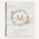 Rustic Wood Floral Watercolor Monogram Notebook. A dainty, boho watercolor wreath with your custom monogram and name in an elegant gold serif typography. This design features a warm, light wood rustic background.