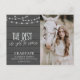 Rustikales Holz mit String Lights & Featuring Grad's Foto - Handgeschriebener Text liest "The Best is to yet to come" mit leuchtenden Saitenleuchten, die über dem Kopf hängen. Fügen Sie einen Absatz mit den Plänen Ihres Abschlusses auf der Rückseite der Karte ein. Wenn Sie es vorziehen, kann dieser Bereich leicht abgeschaltet werden.