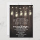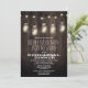 Rustikales Barnholz + Mason Jar Probe Dinner Einladungen - präsentiert sich als Hintergrund wieder gewonnenes Scheunenholz und hängend beleuchtete Mason Gläser mit Glühwürmchen oder nur schlichte Lichter. Die Maurergläser sind an den Saitenlichtern befestigt.
