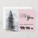 Eine rustikale Naturwaldkarte mit einem majestätischen Kiefernwald und Bären mit einem weichen pastellgrauen Hintergrund. Mama, Vater und Baby. Post Baby Dusche danke Karte.