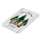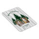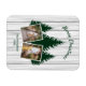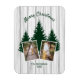 Rustic holiday magnet with gray wood background and dark green trees. Photo templates via Pixabay licensed under CC0 and must be replaced with your own photo