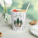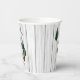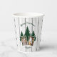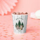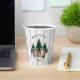 Rustic holiday paper cup with gray wood background and dark green trees. Photo templates via Pixabay licensed under CC0 and must be replaced with your own photo