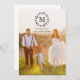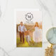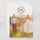 Diese moderne, minimalistische Hochzeitskarte mit einem hübschen, rustikalen Lorbeerkranz, Monogramm-Initial und einem Foto mit Blutwurst. Zusätzliche Fotos und Text können auf Wunsch auf der Kartenrückseite hinzugefügt werden.