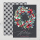 Happy Holidays, Feiern Weihnachten und die Wintersaison mit diesem rustikalen roten, marineblauen und grünen botanischen Kranz mit Blume, heiligen Beeren, Kiefernästen mit bearbeitbarem, grauem, kariertem Flanellhintergrund.