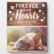 Eine rustikale Gedenktafel für Haustiere, um das Gedächtnis Ihres geliebten Haustiers zu schätze. Mit einem Holzboden, dem süßen Sprichwort "ewig in unseren Herzen", einer Mischung aus weißen Herzen und Pfosten, dem Namen und den Daten der Haustiere.