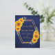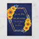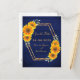 Eine rustikale Landkarte Save the Date. Ein goldenes Imitat mit gelben und orangefarbenen Sonnenblumen. Personalisieren und fügen Sie Ihre Namen, und das Datum der Hochzeit. Eine dunkelmarineblaue, rustikale Holzstallmauer als Hintergrund. Goldene Buchstaben. Die Namen werden mit einem modernen handgeschriebenen Stilskript geschrieben. Zurück: Namen, Datum, Ort der Hochzeit. Keine Hintergrundfarbe.