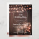 Rustikale 50. Geburtstagsfeier mit Saitenbeleuchtung, Glaskeramikboden aus Glaskeramik und Rose-Tint mit vergoldetem Metallstreifen aus Rose. Personalisieren Sie diese Aufforderung für jedes Alter. Rustikaler Landstil.