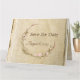 Rustikale Hochzeitseinladung Save the Date mit dem blumengeschmückten Kranz auf altes Papierdesign