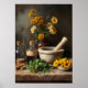 Ein wunderschönes, rustikales Stillleben mit Steinmörtel und Pestle, frischen Kräutern, gelben Blume und Vintagen Glasflaschen mit Korkplatten. Der erdige Hintergrund und der abgenutzte Holztisch verleihen diesem Kunstwerk den nostalgischen Charme, der traditionelle Kräuterpraxen und natürliche Heilung hervorruft. Dieses Stück ist ideal für die Dekoration von Kräuterläden, Naturheilkliniken, Apotheken, Massagetherapieräumen, Wellnessstudios, Yogaräumen oder rustikalen Küchen. Es bringt Wärme, Natur und ein Gefühl von Erbe in jeden Raum.