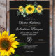 Das Design ist mit einem Strauß von Aquarellgelben Sonnenblumen, Eukalyptus und anderen Blätter und Zweigen auf schwarzem Hintergrund