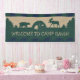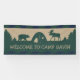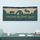 Geburtstags-Party-Fahnenlesung "Willkommen des WaldCampings personalisierte zum Lager [Name]". Aufmachung einen Bären, Elche, Zelt, Bäume und Büffel kariert mit einem blauen und grünen Flanell und brauner Entwurf Kraftpapiers.