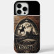 Ein abgebranntes, rustikales Holzschild zeigt eine mondbeleuchtete Landschaft mit einem Reiter auf dem Rücken, der über einen Zaun sprang. Der Name Kenneth wird am Ende des Zeichens deutlich sichtbar angezeigt.