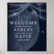 Rustikales Herzbaum String Lights Blue Wedding Welcome Poster. Schönes, elegantes Hochzeitszeichen auf dem Land mit einem ätherischen, traumhaften Gefühl. An den Baumkronen hängen winzige Baumlichter. Ein geschnitztes Herz sitzt auf dem Baum, gewartet für Ihre Monogramm-Initialen. Dieses maßgeschneiderte, moderne Design kann leicht mit Ihren eigenen Details personalisiert werden.