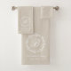 Handtuchhandtuch-Set mit eigenem Familiennamen und personalisiertem Monogramm in einem eleganten, weißen Botanischen Kranz.