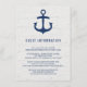 Ein marineblauer blauer Anker auf einem Holz wie weißlicher Hintergrund. Ideal für eine Hochzeit mit Wassersport, vor allem wenn man sich in einem rustikalen oder Vintagen Stil aufhält. Diese Karten können mit jedem beliebigen Text angepasst werden - nützlich für Anfahrtszeiten, Unterkunftsinformationen, Menüs, Programme oder Party Einladungen.
