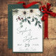 Dieses rustikale Save the Date Hochzeitskartendesign besticht durch einen Topfbouquet aus Kiefern, roten Beeren, weißen Blume und Eukalyptus mit einem Sprinkle aus Imitaten, goldenen Glitzer. Der Hintergrund ist weiß mit einem dunkelgrünen und bunten Rahmen. Dieses Design ist Teil der Rustikalen Berries Winter Floral Wedding Suite von Karten erstellt von Simply Farmhouse Press.