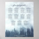 Diese elegante Hochzeitskarte bietet Platz für 110 Gäste an 11 Tischen (10 Personen pro Tisch). Das Design ist rustikal und dennoch elegant, mit einer waldreichen Bergszene mit einem Hang bedeckt in einem miessigen blauen Kiefernwald. Der Titel lautet "Bitte finden Sie Ihren Tisch" in laky Skriptkalligrafie. Es gibt Platz für die Namen des Paares und das Hochzeitstag.