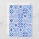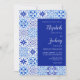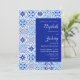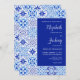 Dieses rustikale Design zeichnet sich durch ein Hintergrundmuster aus blau-weiß Aquarell portugiesischen Fliesen oder Azulejos. Personalisieren Sie sie mit den Namen der Braut und des Bräutigams in weißem Kalligraphieskript und dem verbleibenden Text in einer Kombination aus Sans Serif, Copperplate und Kursivschrift auf einem blauen Rechteck, das mit dem rechten Rand der Karte ausgerichtet ist. Auf der Rückseite wird ein passendes Fliesenmuster angezeigt.
