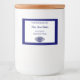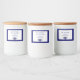 Ein individueller Aufkleber für Lebensmittel, Backen oder Konservieren mit Schrift- und Blockbriefen und rustikalen Holzschnitt-Blume in blau mit tiefblauem Rand.
