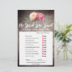Dieses rustikale Blume-Bouquet "sagte er sagte, sie sagte" Quiz-Spiel ist perfekt für ein Blumenland Thema Brautparty. Auf der Vorderseite der Spielkarte steht "er sagte, sie sagte", was ein lustiges Quiz über Braut und Bräutigam ist. Auf der Rückseite der Karte finden Sie ein Wort mit Wörtern und Phrasen, die mit Hochzeiten zusammenhängen. Das Design besticht durch eine elegante Anordnung von blau-rosa Aquarellbeinen auf einem holzstrukturierten Hintergrund. Personalisieren Sie die Spielkarte mit dem Namen der Braut und dem Datum des Polterabends.