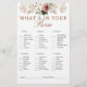 Dieses rustikale Blumenspiel "What’s In Your Purse?" verleiht Ihrem Brautparty eine spielerische und persönliche Touch. Die Gäste können Punkte sammeln, indem sie Gegenstände abchecken, von Lippenstift bis hin zu loser Veränderung! Die eleganten Blüten, Elfenbein und staubigen Rose harmonieren wunderbar mit rustikalen oder bohobotischen Brautpartys. Ein Teil unserer passenden Brautparty Kollektion - perfekt für ein zusammenhängendes, stilvolles Event.